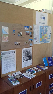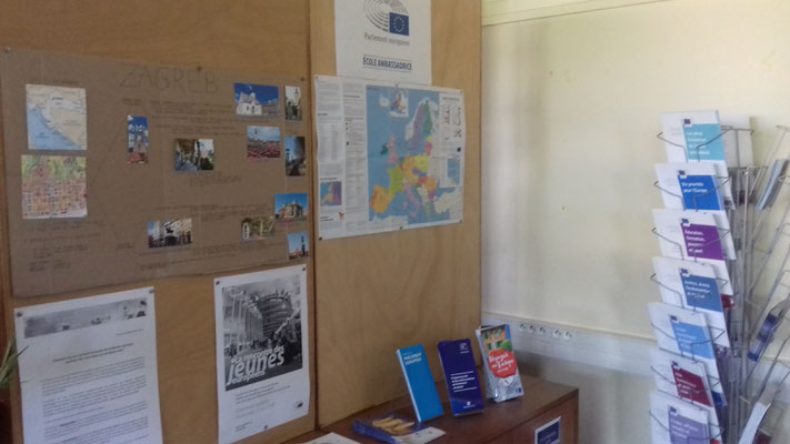De plus, ce mardi après-midi, avec notre collègue Florence GONDOLO, nous avons mis en place l'Infopoint "Ecole ambassadrice du Parlement européen" au CDI, avec toutes les brochures expédiées par le Bureau d'Information. Le présentoir et les affichages sont situés à droite en entrant dans le CDI, juste après les ordinateurs. Cette installation/présentation n'en est qu'à ses débuts, des modifications et/ou apports ultérieurs viendront améliorer ultérieurement sa visibilité. Nos élèves peuvent donc y avoir accès afin de compléter leurs connaissances sur le thème de l'UE.