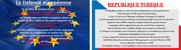 Des diaporamas de présentation de pays de l’UE et de thèmes touchant à l’actualité sont en cours d’élaboration, avec pour buts de nous apporter des éléments de culture générale sur certains de nos partenaires européens, de mieux appréhender les actions/échanges avec l’UE dans ces pays ciblés, mais également de mieux comprendre les décisions européennes sur des problématiques posant des interrogations sur notre continent.